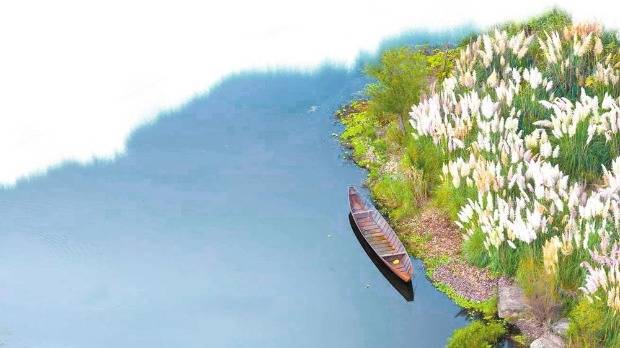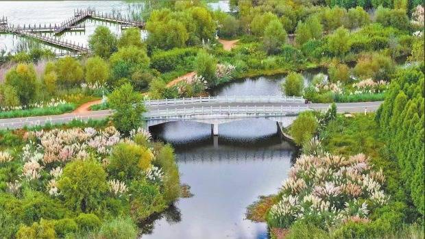 荻花与碧水、绿植构成秋日美景。